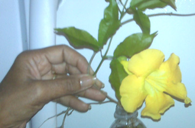 The flowers are a beautiful bright yellow with trumpets of about 3 inches. Each flower trumpet has five petals of which one petal on every flower is twisted about 90 degrees.