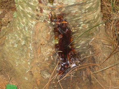 The gum will probably be clear, in which case your job is to improve the growing conditions for the tree. Estimate the square foot area covered by the tree limbs and branches and increase it by 25%. (Example: if the tree covers 200 square feet, increase the number to 250 square feet.) For every 100 square feet scatter 4 pounds of garden lime under the tree. (For our example, you’d need 10 pounds.) This will gradually raise the soil pH.
