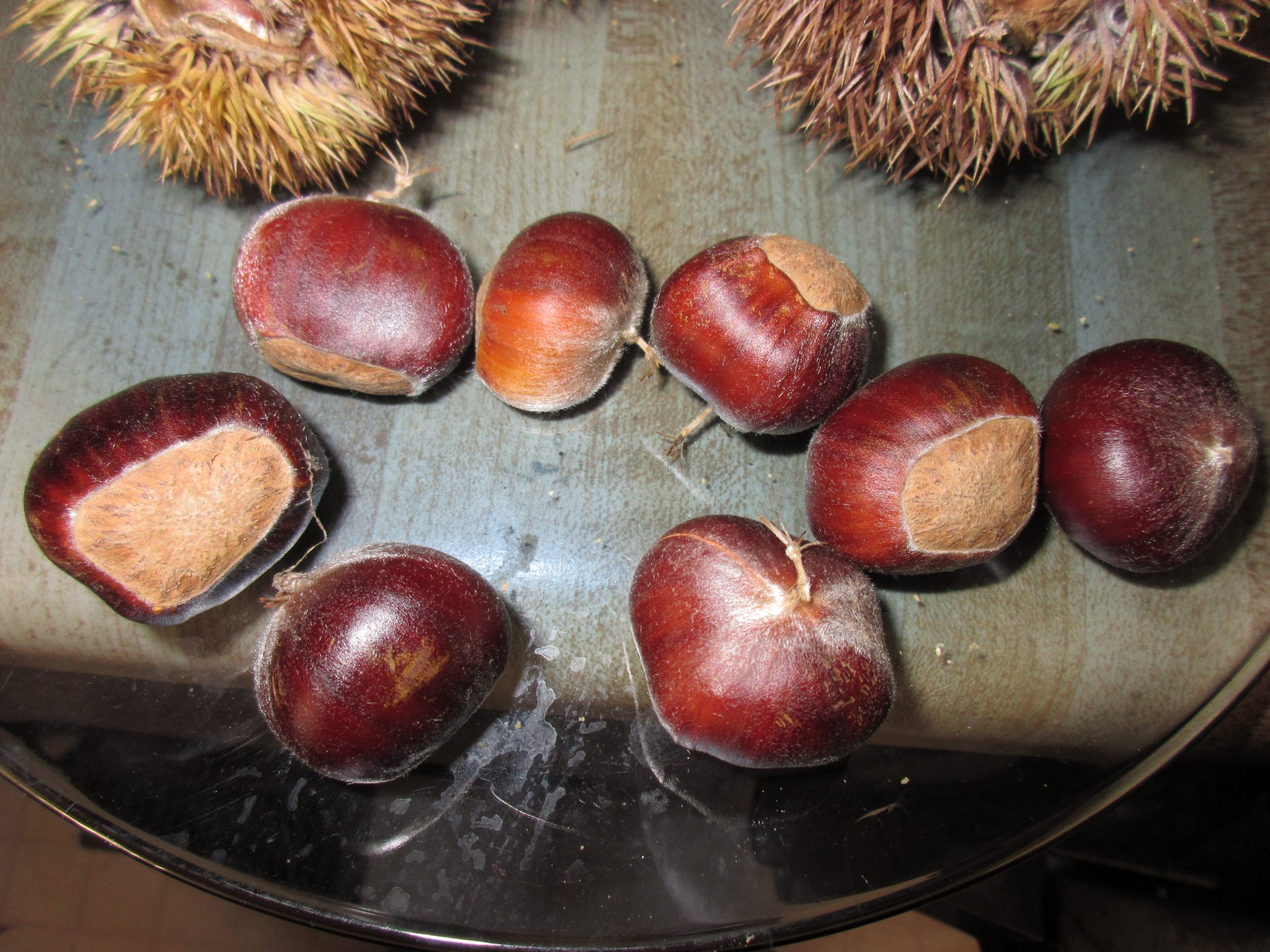 A: They are Chinese chestnut burs. Each one contains 1 – 3 large brown seeds. The nutmeat in each seed is edible once the hard brown skin is removed by roasting and peeling.