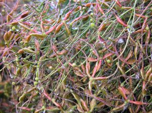 Clematis terniflora (Sweet Autumn Clematis) has seedheads which have about 5 achenes which are orange yellow to red-brown, pear-shaped, with greyish or reddish brown plumose tails about 1.6″ long.