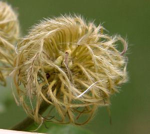 “Clematis virginiana has about 40 to 60 achenes, hairy with silvery plumose tails. I observe the seed head turns more golden as it ages and is about 2″ long. So the distinguishing features are 4 or 5 skimpy achenes to 40 to 60 glorious achenes. This is another reason why the native is more attractive in seed though not necessarily in number of flowers or fragrance.