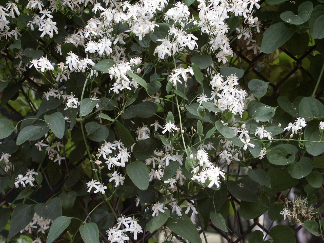 The invasive sweet autumn clematis, Clematis terniflora, has similar white flowers but is a common garden invader.