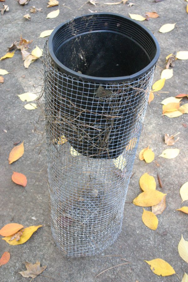 I then buried the cylinder vertically in the middle of the compost pile and placed a ten inch black plastic pot into the open end of the tube. When I needed to add kitchen scraps I lifted out the plastic pot, dumped the material I had into the wire cylinder and replaced the pot. Any liquid in the food waste quickly drained through the wire.Worms from the center of the pile could crawl into the tube to eat what they wanted. Best of all, Rattus rattus was kept at bay by the wire and plastic pot lid.