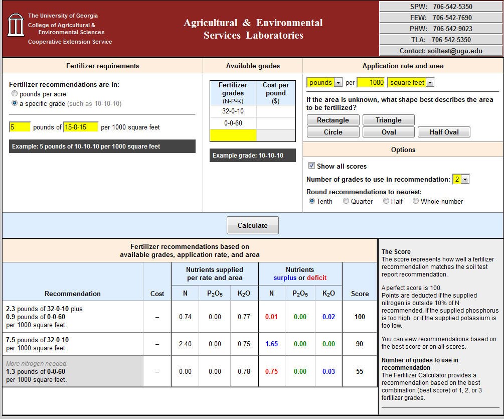 While the 32-0-10 could be used if you cut your 15-0-15 recommendation in half and the 24-4-11 and 16-4-8 might also be appropriate, the calculator found an exact recommendation: 4.3 lb. of 21-0-0 plus 1.5 lb. of 0-0-60 per 1000 sq. ft.