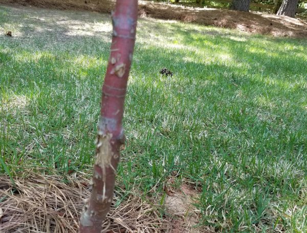 Q: Last fall we planted a small coral bark Japanese maple. It seems to be doing well this spring except for some damage to the trunk. At first I thought landscapers had hit it with a string trimmer but then I noticed the spots of damage are the same all the way up to its leaves.