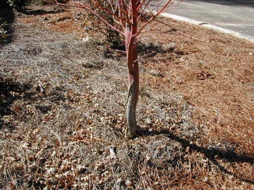 Use a trowel to carefully excavate around the trunk until you find the major roots flaring off from the trunk. If they are more than an inch below the soil/mulch line, my diagnosis is correct.