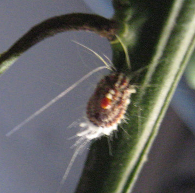 A crawler attaches to a plant stem and begins sucking sap. Adult females form a hard, brown, scale-like body and then start producing eggs beneath the shell. The eggs are encased in wax, which grows from under the shell, looking like a white cushion.