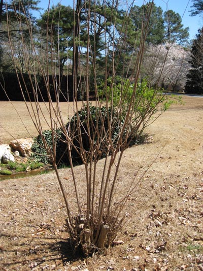 A hint on pruning in the mean time: choose 2 – 3 upright shoots in each plant and remove everything else down to the ground. Let the vertical shoots become the main trunks of the crapemyrtles over the next two years. remove any side branches on the lower half of each trunk each spring. This should give you trunks near the ground that won’t interfere with cars passing by. Most of the branches then will be well above car roofs.