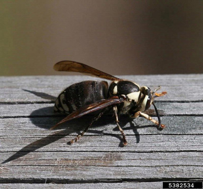 A: I love your cocktail simile! The most likely candidate for making the damage is a European hornet. Both hornets and wasps strip soft bark from healthy plants to use in making their nests. European hornets go so far as to feed on sap released by their chewing. A European hornet resembles a cicada killer wasp but is wider and has more hair on the thorax and abdomen. It nests in hollow trees, as compared to the bald-faced hornet, which builds its paper nests in trees and shrubbery. I have examples of the damage at bit.ly/GAhornetdam.