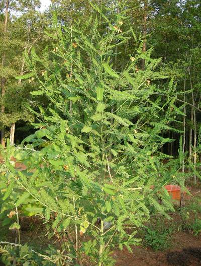 Q: I’m hopeful someone can help identify this plant. It has mimosa-like leaves that close at night, but it is upright – 10-12 feet tall. The stalk was green, until the seedpods came out, and now it is purple. The leaves are almost gone, now, leaving the seedpods.