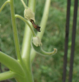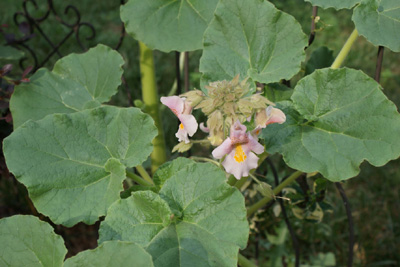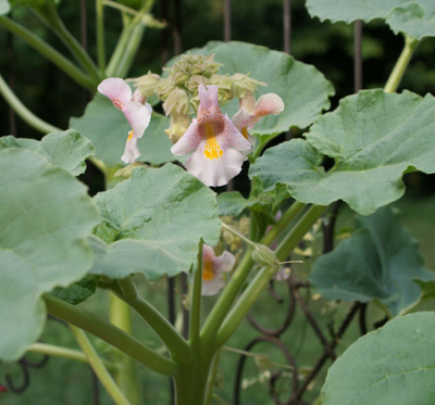 A: Photos of this distinctive plant were originally sent to me by Vicki H., who had queried everyone she knew about it. It sprouted under her birdfeeder. The orchid-like flowers, sticky leaves and odd seed pods were like nothing she (or I) had ever seen.