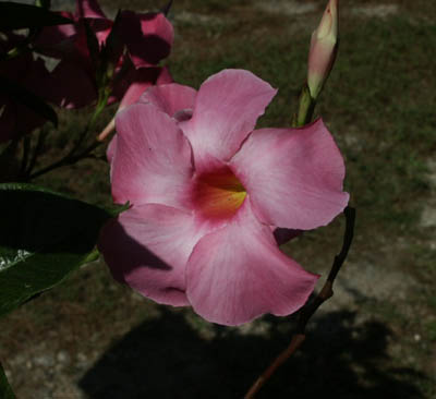 Dipladenia is really part of the mandevilla clan: Mandevilla sanderii. It has very little vining habit – more like a spreading bush. It has pinkish flowers but it won’t cover your mailbox like a common mandevilla vine, Mandevilla splendens, or allamanda will.