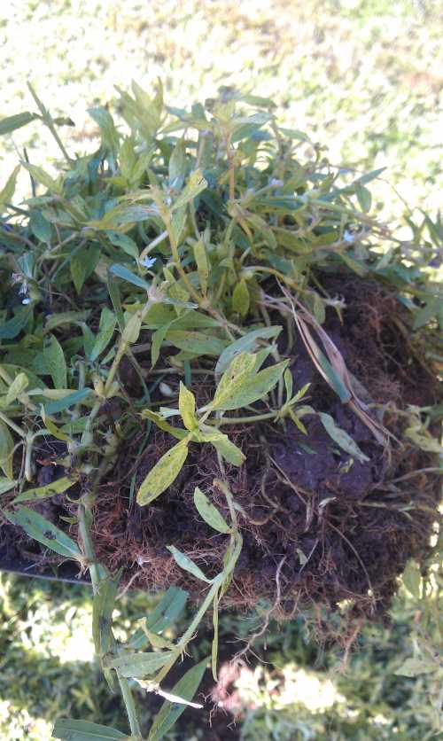 If you find the plant when it’s blooming, the ID is easy. Doveweed has blue or purple flowers; buttonweed has white flowers.