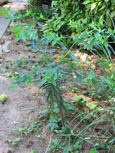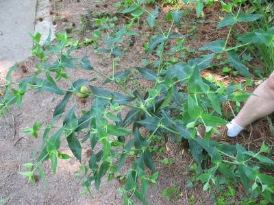 Q: The attached photos are of an odd plant that pops up in different places each year in my backyard. The leaves on the bottom part of the stem are different from the leaves at the top. What is it?