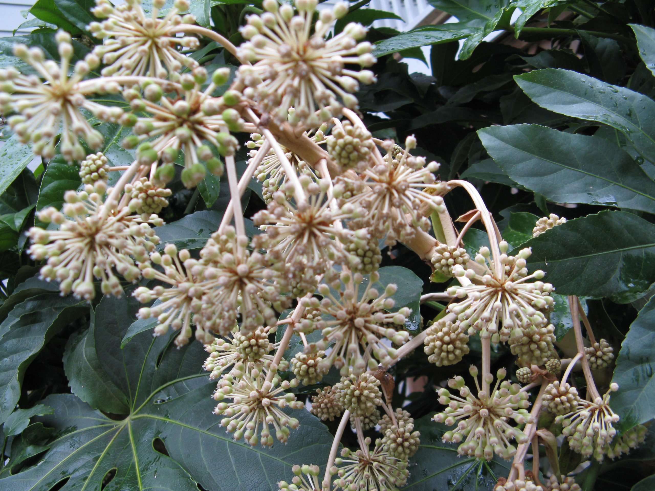 Q: I never knew fatsia would bloom in December! The plant is in a fairly protected area and gets high shade most of the day in the summer. I guess it likes it there.
