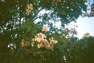 It has distinctly pink seed pods in early fall, unlike the brown ones that follow the yellow flowers of common goldenrain tree Koelreuteria paniculata.