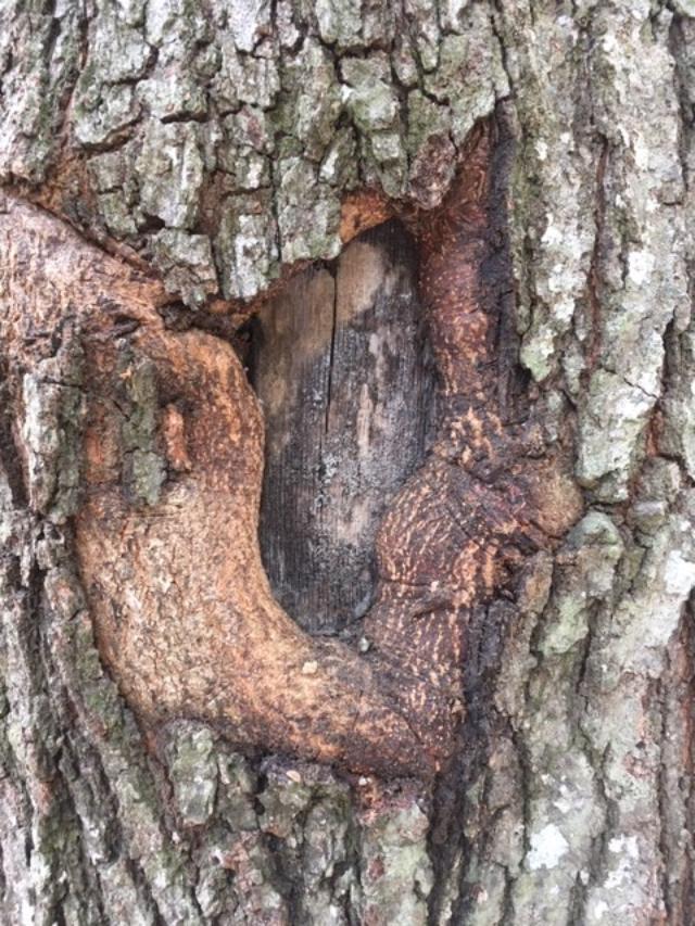 The rounded, ropey callus tissue around the edge of the damage is the tree’s attempt to seal the bark edge and to put fresh tissue on top of the wound. Over the next year, the hole in the bark will gradually get smaller and you won’t see inside the wound anymore.