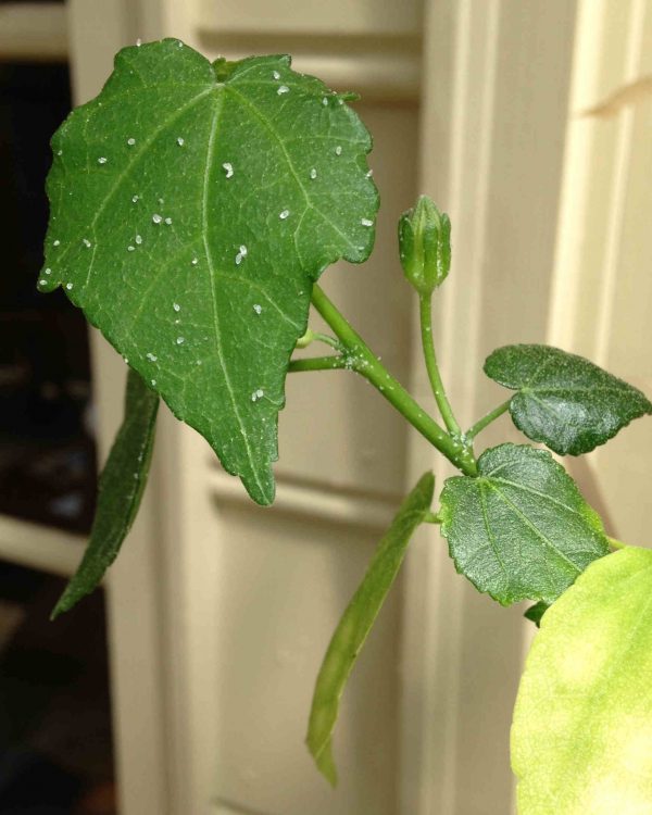 Q: There are irregular shaped, granular deposits on front and back and upper stems of my miniature hibiscus leaves, grown in a sun room. They feel like fine sand. What is it and how to control?