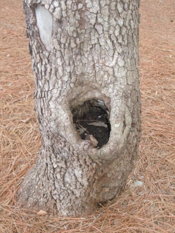 A: Holes that form from limb removal are common. They can be prevented by using proper arborist pruning techniques. But now that you have the hole, do not fill it. Research has shown that tar, expanding foam, concrete, and caulk inevitably crack around the edges and allow water into the hole. Protected from drying, the hole grows bigger. Do not try drilling into the trunk to drain the cavity. The drilling will damage the protective cell layers the tree has established to contain the rot. The best course of action usually is to leave tree hollows alone. If you simply must do something, fashion a “roof” over the hole using sheet tin or aluminum, painted to match the tree. This might shed water enough water to keep the hole dry.