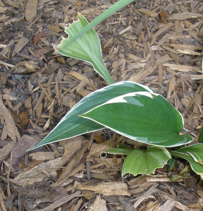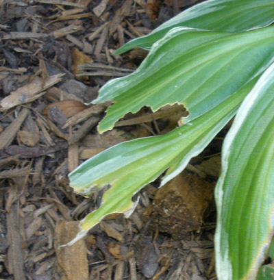 Q: Can you identify what is causing the damage to my hostas? I just noticed it today and we had a small hail storm yesterday. But could slugs have caused the damage?