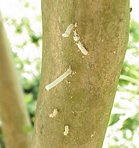 I am familiar with the “toothpicks“ that show up on woody plants, like crapemyrtles, when they are attacked by Asian ambrosia beetles. They are particles of wood bound by minuscule webbing that are pushed out of the hole by the female beetles.