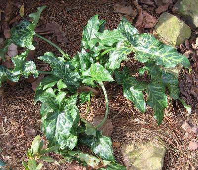 A: It’s Italian arum – a GREAT winter plant for shade to part sun. I have mine combined with hellebores. The behavior you saw is simply the way it grows. It has a small tuber belowground that produces leaves in fall. The leaves grow rapidly and attractively through winter.