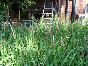 Q: This grass appeared in one of my flower beds three years ago. It is massively aggressive, and has choked out everything in the bed. Frequent attempts at pulling it up are futile. It is about waist high, tough, like a saw grass, and spreads by runners two inches under the ground.