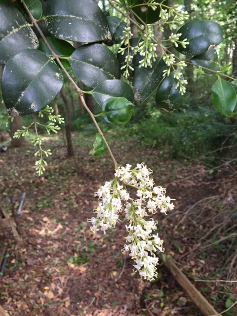 I thought at first that this plant was Carolina cherrylaurel but my astute colleague Theresa Schrum pointed out that the leaves are opposite each other on a stem, unlike the alternate arrangement on cherrylaurel.