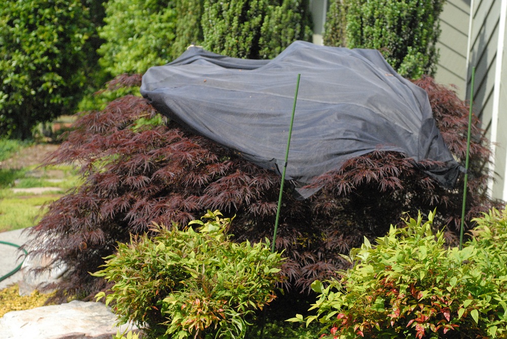 “The loss of the second set of new leaves would indicate a lack of sufficient energy reserves in the tree. Due to this, it’s most likely that stems and branches may die as well. Recommend a light feeding with a fertilizer having a low N-P-K value such as 3-4-5. In addition to fertilization and limited pruning, gardeners should look at protecting the crown of their maple trees, especially the lace leaf varieties. Many of these trees now have insufficient protection from bright sunshine. Without a good leaf canopy to protect the upper trunk, it will be susceptible to sunburn, which, in severe cases, results in die back of the crown – leading to more exposure and more damage. For my clients with laceleaf Japanese maples with exposed crowns, I will be erecting a protective cover of shade cloth to help the trees through this summer and aid in their recovery. ”