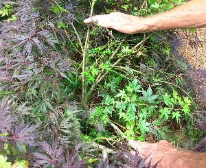 Q: I have this new growth in the top of my maple. The green leaves are on two stems, one of which is growing from the main trunk about twelve inches above ground level and another small branch is growing from a branch which has dissected purple leaves. No one can tell me what I have, or if I should just cut this growth out.