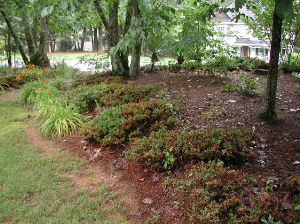 A: This is a common problem…the trees originally planted above the junipers were small enough to let plenty of sunshine through. In the intervening years, shade has become more and more dense….and the junipers more and more unhappy.