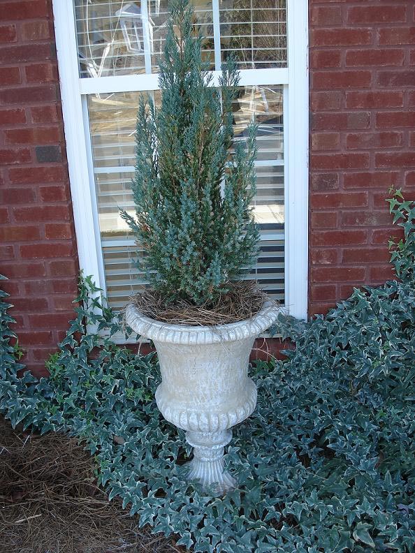 A: It looks like a juniper that became too dry after planting. The container is pretty small for that size plant (double the current size would be better). On sunny or windy days, the juniper loses so much water that you have to water the pot every day to keep it happy. Check the moisture in the soil EVERY day (winter and summer) …..or get a bigger pot….or replace the juniper with a conical boxwood.