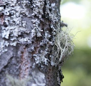 Interestingly, a lichen is a “sandwich” made of algae in the center and fungus on the outside. The algae makes food from sunlight and air; the fungus protects the algae and supplies moisture. They live together symbiotically.