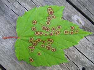 A: You have maple eyespot gall. Although it looks like a fungal disease, it’s actually caused by a midge (a small fly-like insect). The female lays eggs in the undersurface of the leaves. The maggot that hatches develops quickly and produces a hormone that causes the bright red and yellow rings around the original egg damage.