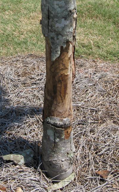 Bark missing completely around the trunk base – YER OUT!