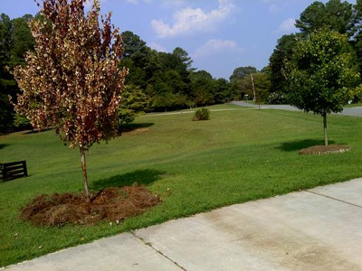 Whenever a tree is planted it is imperative that the large roots be placed at the soil surface. If not…..you see the result.