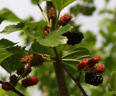The mulberry was originally imported from China in the 1600’s to feed silkworms in an effort to start the silk industry in the Americas. Silkworms wouldn’t grow here – but the mulberry tree certainly does. It is generally considered a weed tree because of the mess birds make after eating the fruit. Buy a cover for all your vehicles when you plant mulberry seedlings!