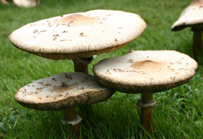 The mushrooms might be unsightly but they do no harm to the turf. They are simply a signal that Mother Nature is doing her job consuming the thatch or tree roots under your grass.