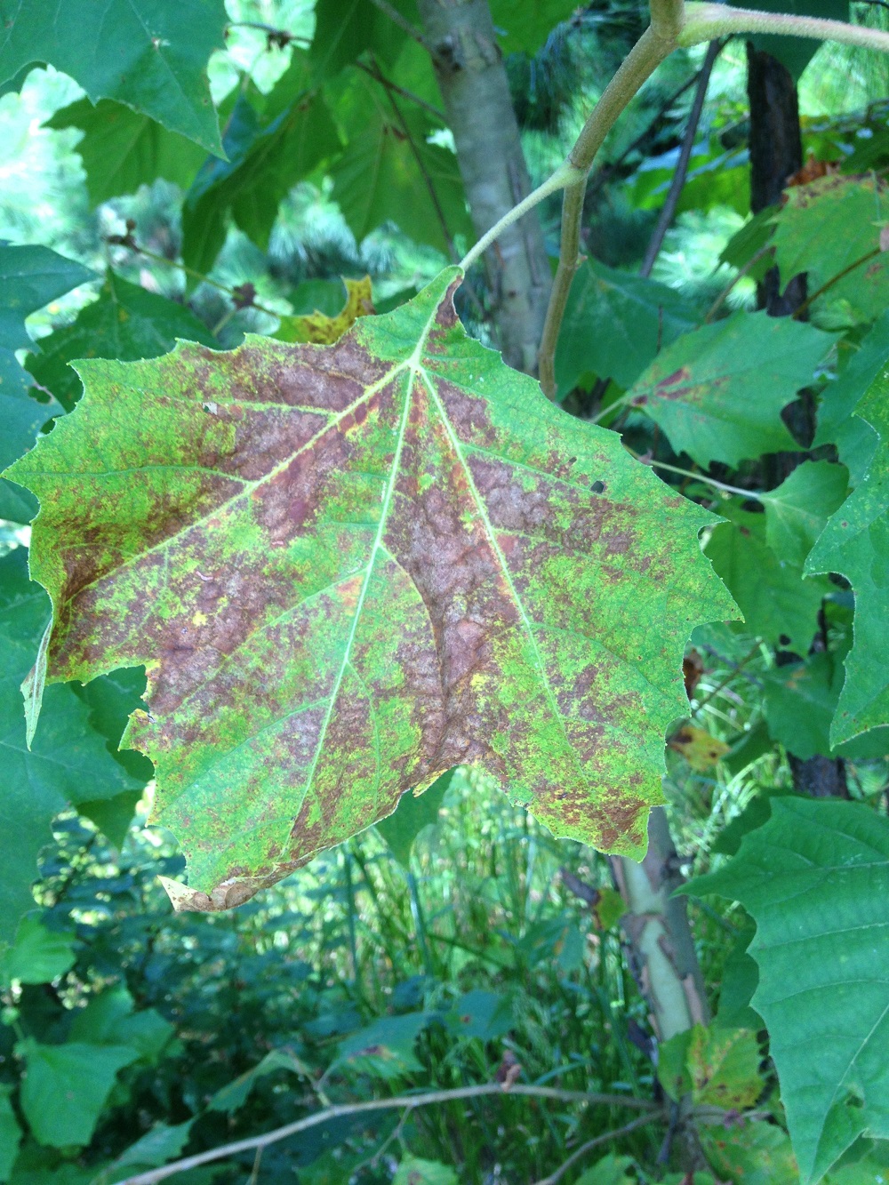 A: It’s bacterial leaf scorch. Sadly, there is nothing you can spray. Bacterial leaf scorch is a serious disease that affects mainly oak trees but can cause great harm to sycamore, sweetgum and ginkgo.