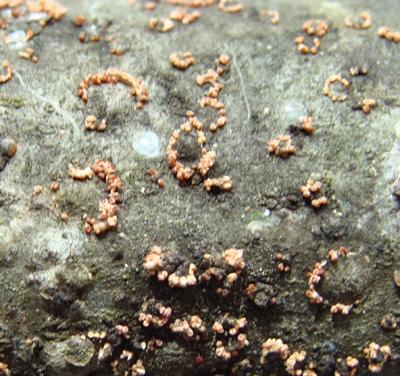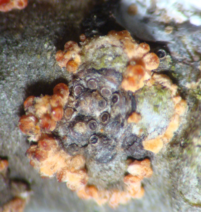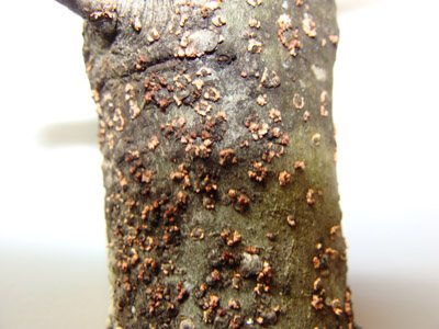 Jean immediately knew what it was! The pink/orange thingies are a fungus (Fusarium) that likes to attack scale insects in cool, damp weather. Looking more closely at Frank’s pictures, I could see the round scale on the tree bark….and the fusarium masses slowly consuming the scale.
