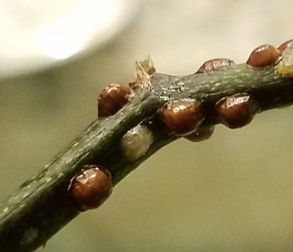 A: They are brown soft scale insects on your plant’s flower stem.