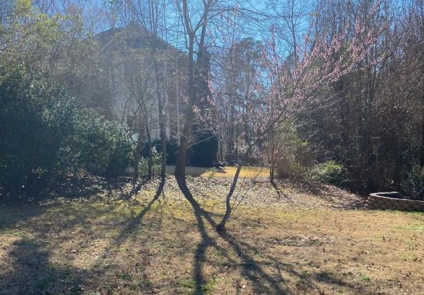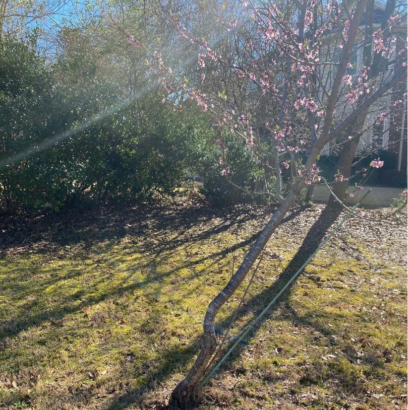 Q: I planted this peach tree in my daughters yard five years ago. It’s growing slow but made some peaches. Is there anything you can suggest to straighten it or replant it? The bigger it gets the sillier it looks.