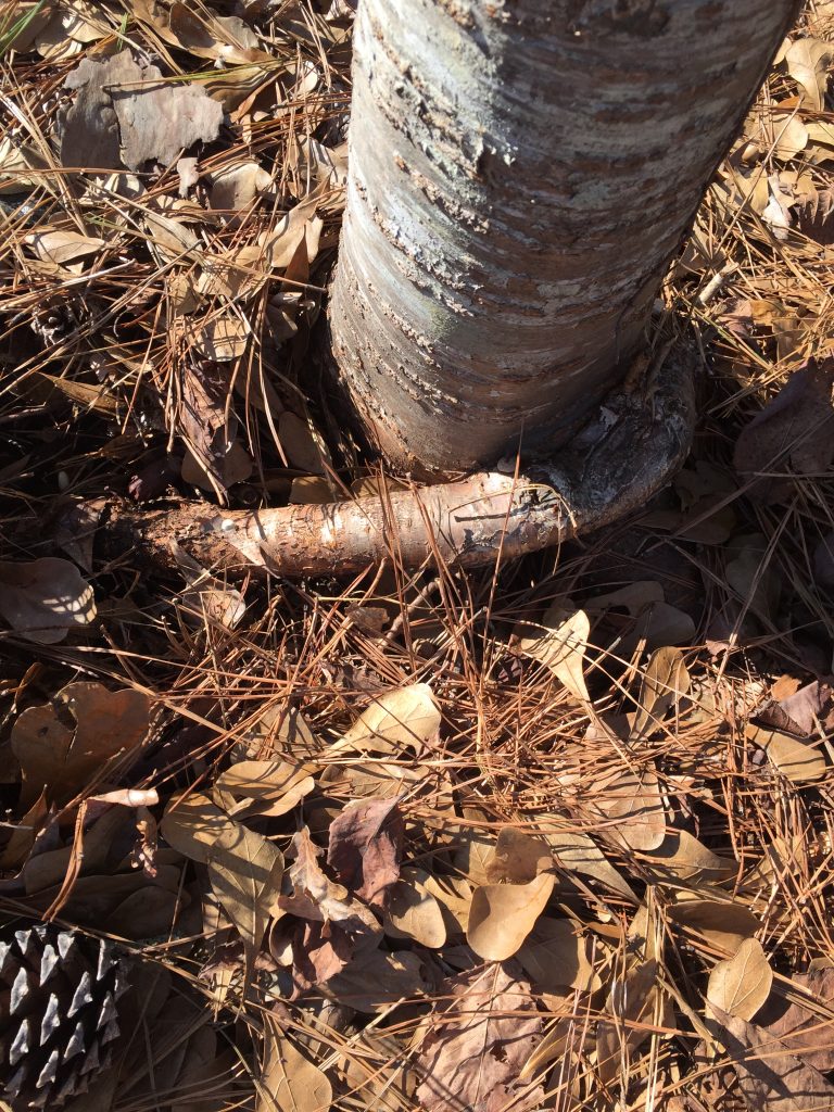 When a root closely circles a tree trunk rather than growing outward, it is called a “girdling root”. The situation usually starts when the tree is young. Somehow a root begins circling the trunk. As it grows larger and the trunk expands, pressure against the tree base limits water and nutrients going to the leaves.