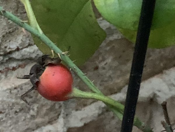 A: You’re seeing the rose seedpods, known as “hips”. You might have seen “rose hip tea” at some point in your life. As the name implies, a tea that’s high in Vitamin C can be made from rose hips.