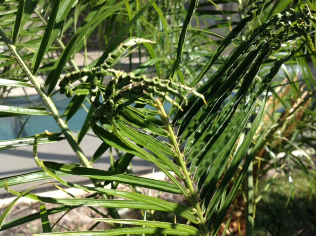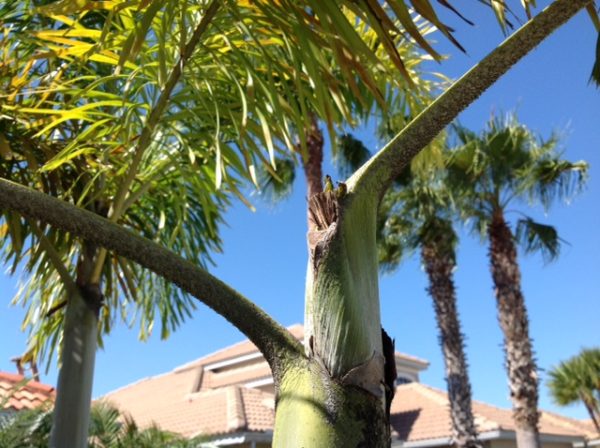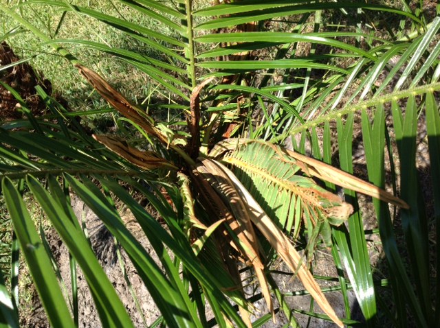 Q: I’m in Bradenton, Florida and we have a triple foxtail palm that was installed by a tree company two years ago. Six months ago the center fronds grew really long and then just fell over dead. New ones that are coming out are curly and stunted. The same thing has happened to my pigmy date palm. Can you tell me what is wrong?