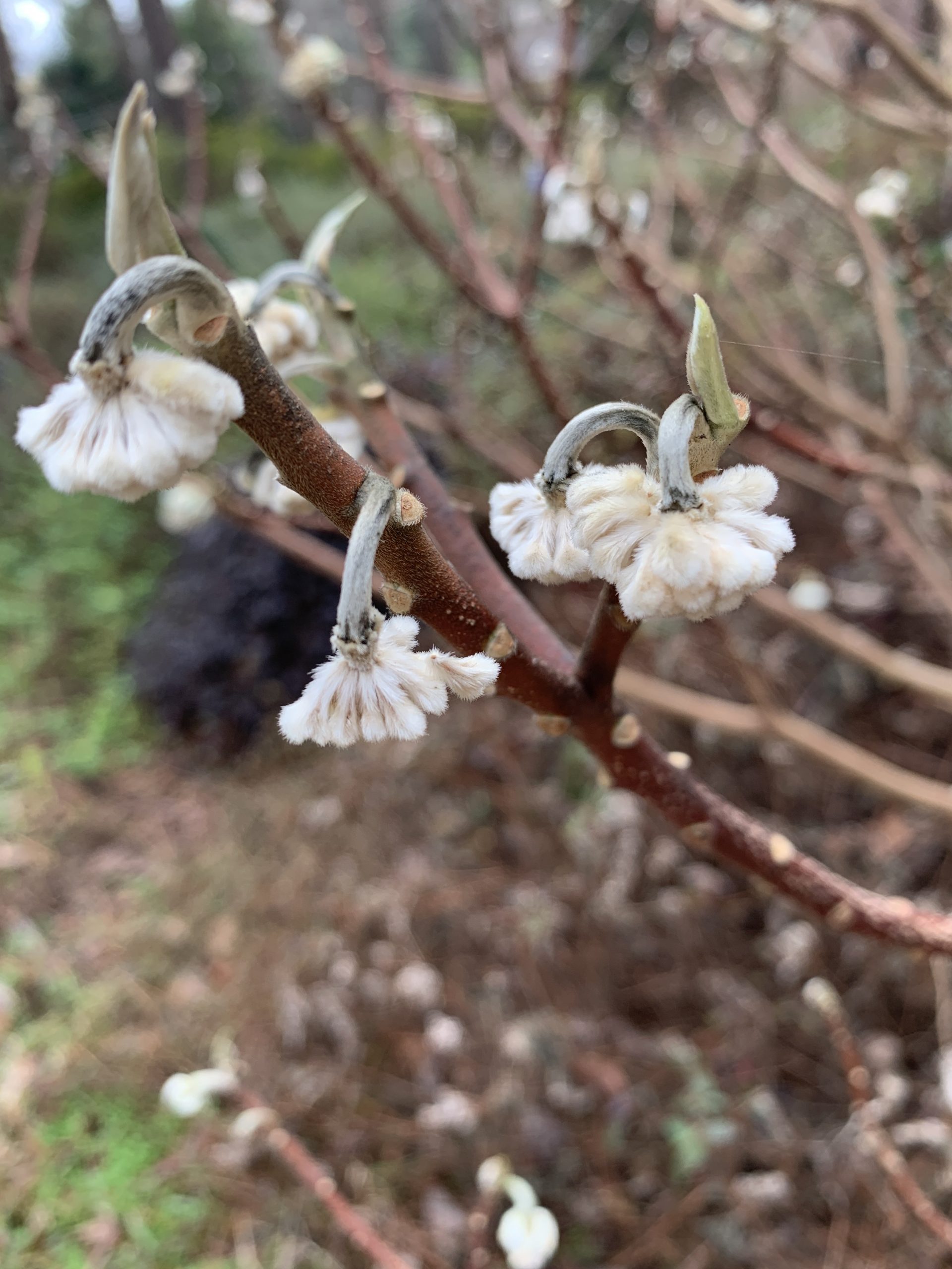 A: I think the problem was caused by cold, not drought. On November 11-12, 2019, temperatures dropped suddenly down to 25°. A couple of weeks afterward, a radio caller described the flowers on her paperbush as being crumbly and falling readily when touched. I saw the same thing on my own plant. As the weeks have passed, I have seen most of my flowers disappear. My guess is that our plants did not have enough time to acclimate to the sudden November cold and that caused the effects we are seeing now.