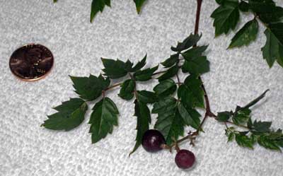 A: Peppervine, Ampelopsis arborea. It is kin to porcelain berry and possum grape