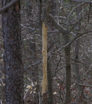 Q: I have a dead tree, 20′ – 30′ tall, in my backyard. It appears to have been gnawed, like by a beaver, around 10′ – 15′ off the ground. Any idea as to what is doing this?