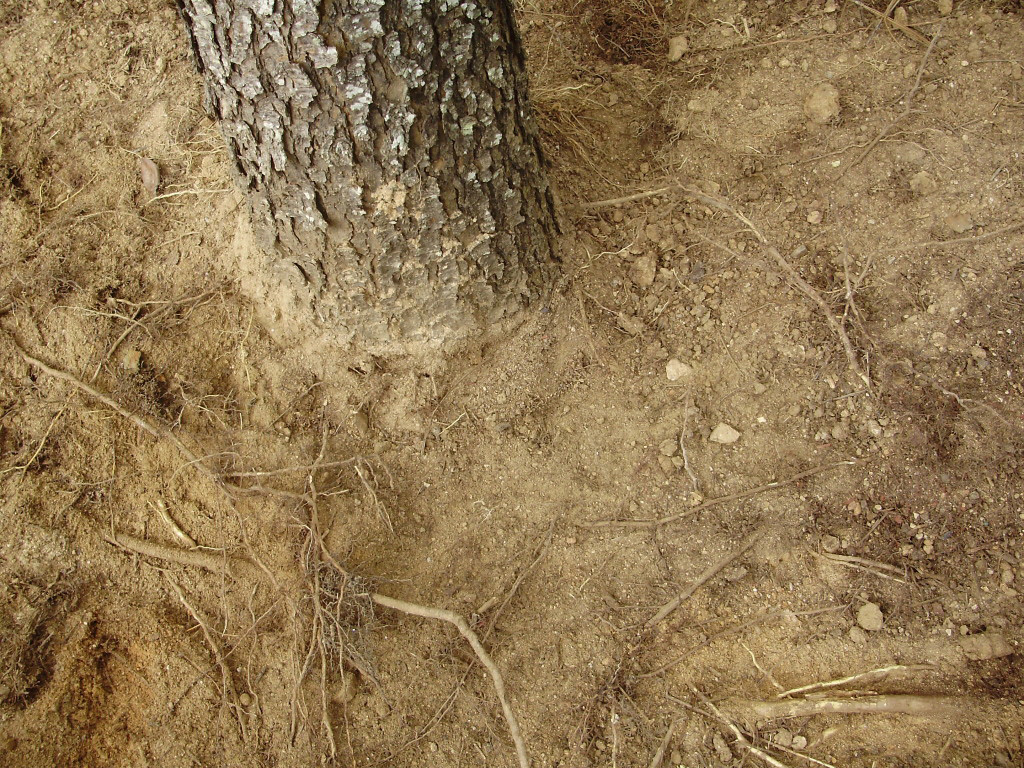 A: I think this is yet another example of the tree having been planted too deep originally. If the main roots are buried several inches below the soil surface, weaker roots emerge from the trunk closer to ground level. Summer drought is sure to affect the tree as a result because these adventitious roots are not able to absorb moisture as efficiently as the original roots could.