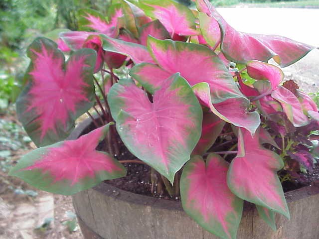 Caladiums are old-fashioned bulbs that have become more popular in recent years. Plant breeders have developed varieties that can withstand much more sunshine than previous strains. Leaf colors from deep red to pink to mostly white allow for landscape color throughout the year, without depending on flower blossoms.